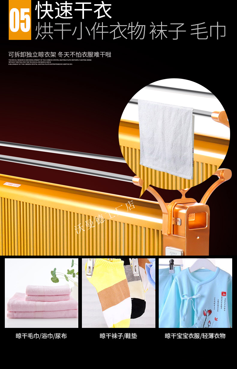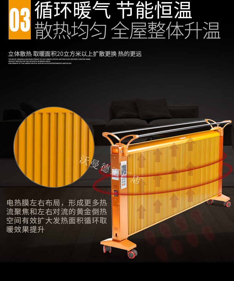 碳晶原子以“布朗運(yùn)動(dòng)”原理為基礎(chǔ)通過遠(yuǎn)紅外制熱,熱轉(zhuǎn)換率可達(dá)99.8%。,全面散熱,比普通的電暖器熱量提高1倍,帶萬向輪底座,膨脹螺絲,壁掛,移動(dòng),方便好用,讓室內(nèi)不在干燥。